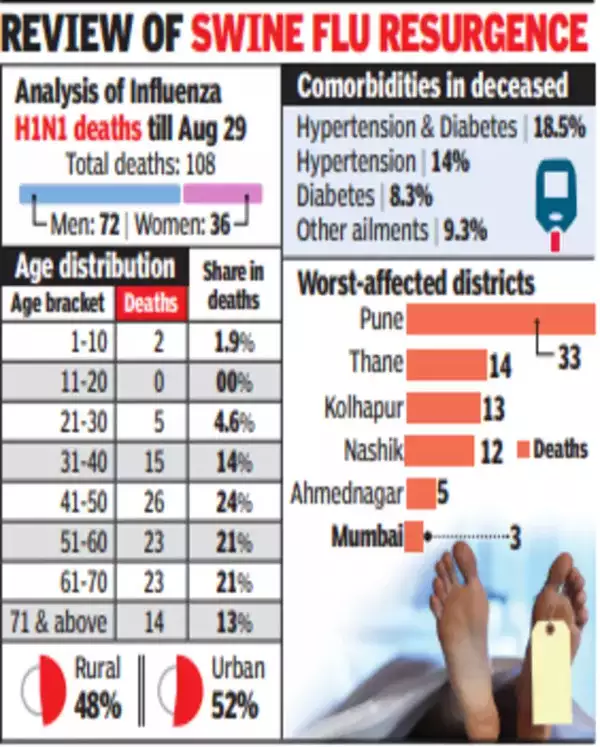 MUMBAI: Nearly 80% of the influenza H1N1 deaths in the state this year have been in age groups above 40. An analysis of 108 swine flu deaths has also found the highest fatalities among individuals with dual comorbidities of diabetes and hypertension. Around 52% of the deaths are from urban areas.