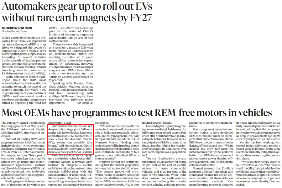 India's automobile majors are preparing for a future less dependent on rare earth magnets (REMs), to safeguard the country’s burgeoning electric vehicle (EV) sector against global supply shocks…According to several industry insiders, nearly all leading passenger and commercial vehicle manufacturers are now working towards launching vehicles powered by REM-free motors by 202627 (FY27). `We need to. In some cases, the deadline may be FY27; others can possibly take longer,’’ said Mahesh Babu, CEO of Switch Mobility, the EV arm of commercial vehicle giant Ashok Leyland.
