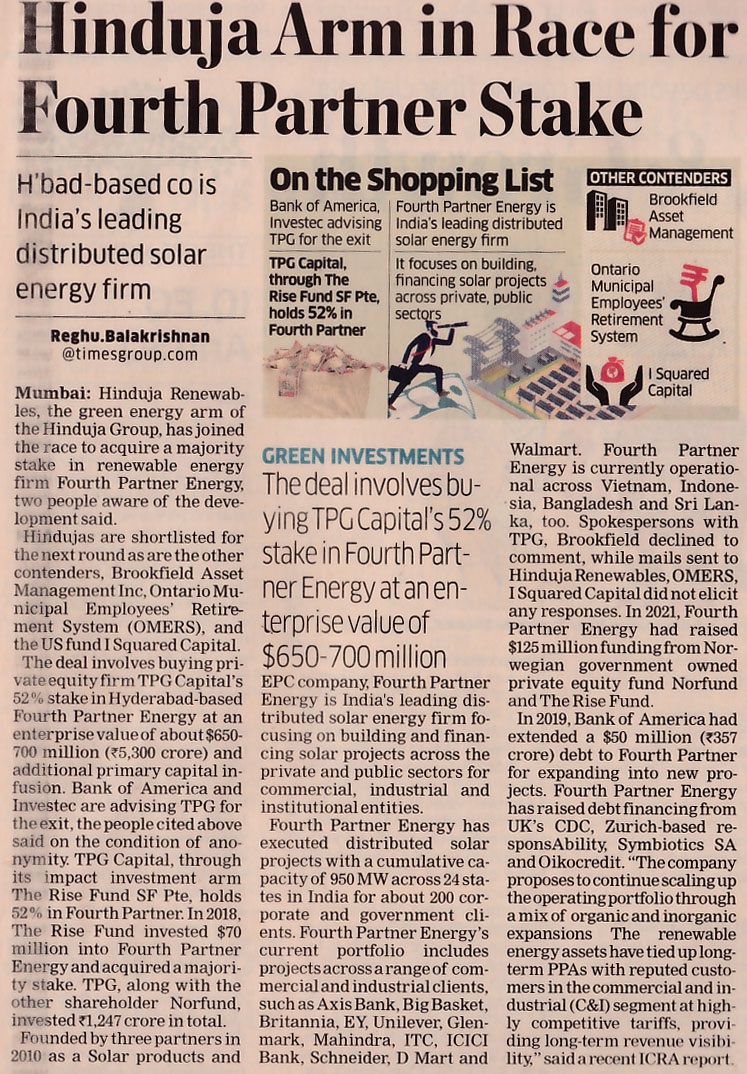 Hinduja renewables joins race to buy major stake in Fourth Partner Energy